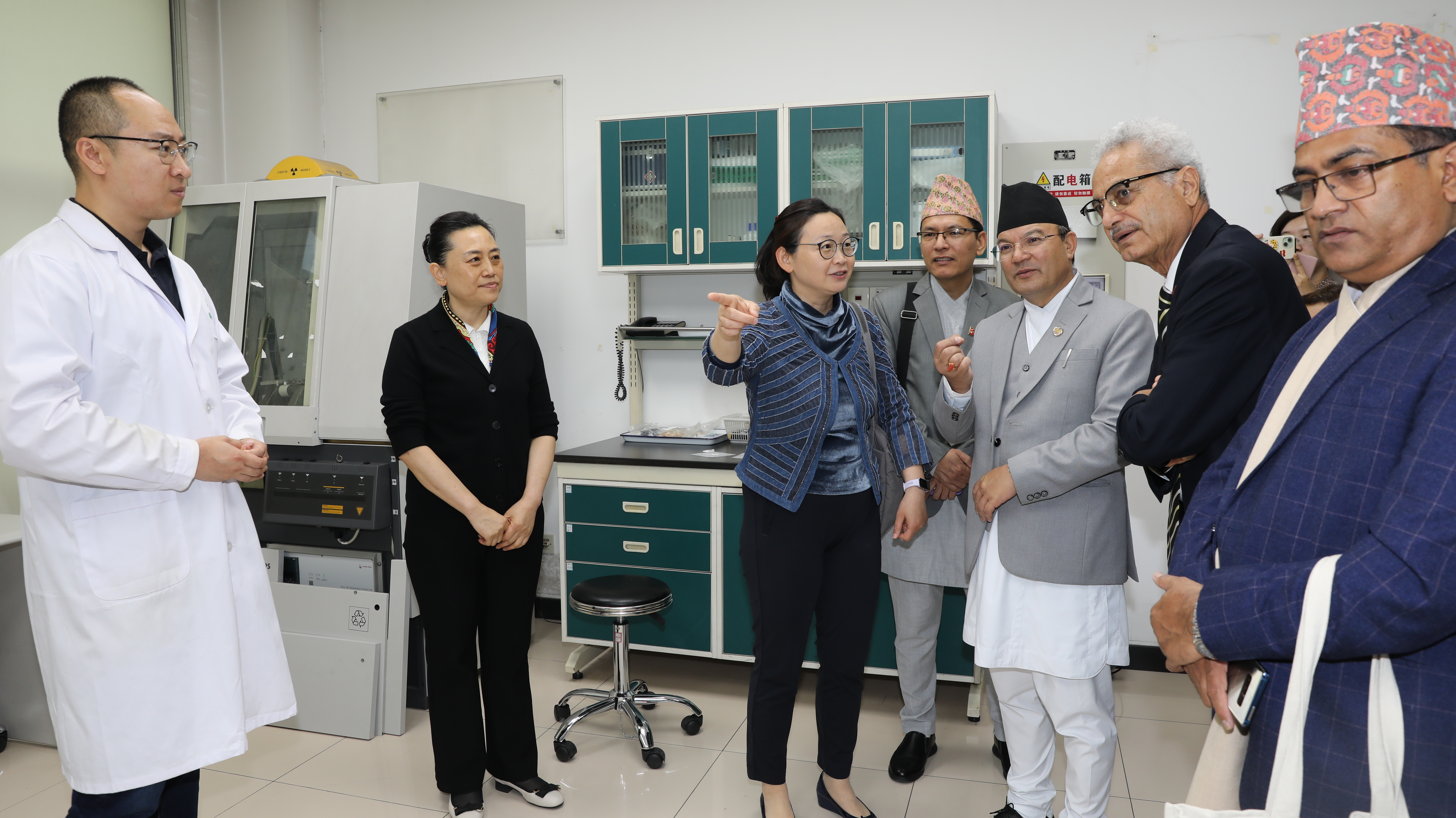 尼泊尔森林与环境部部长塔库里(右三)和尼泊尔驻华大使奥利(右二)参观竹材检测设备