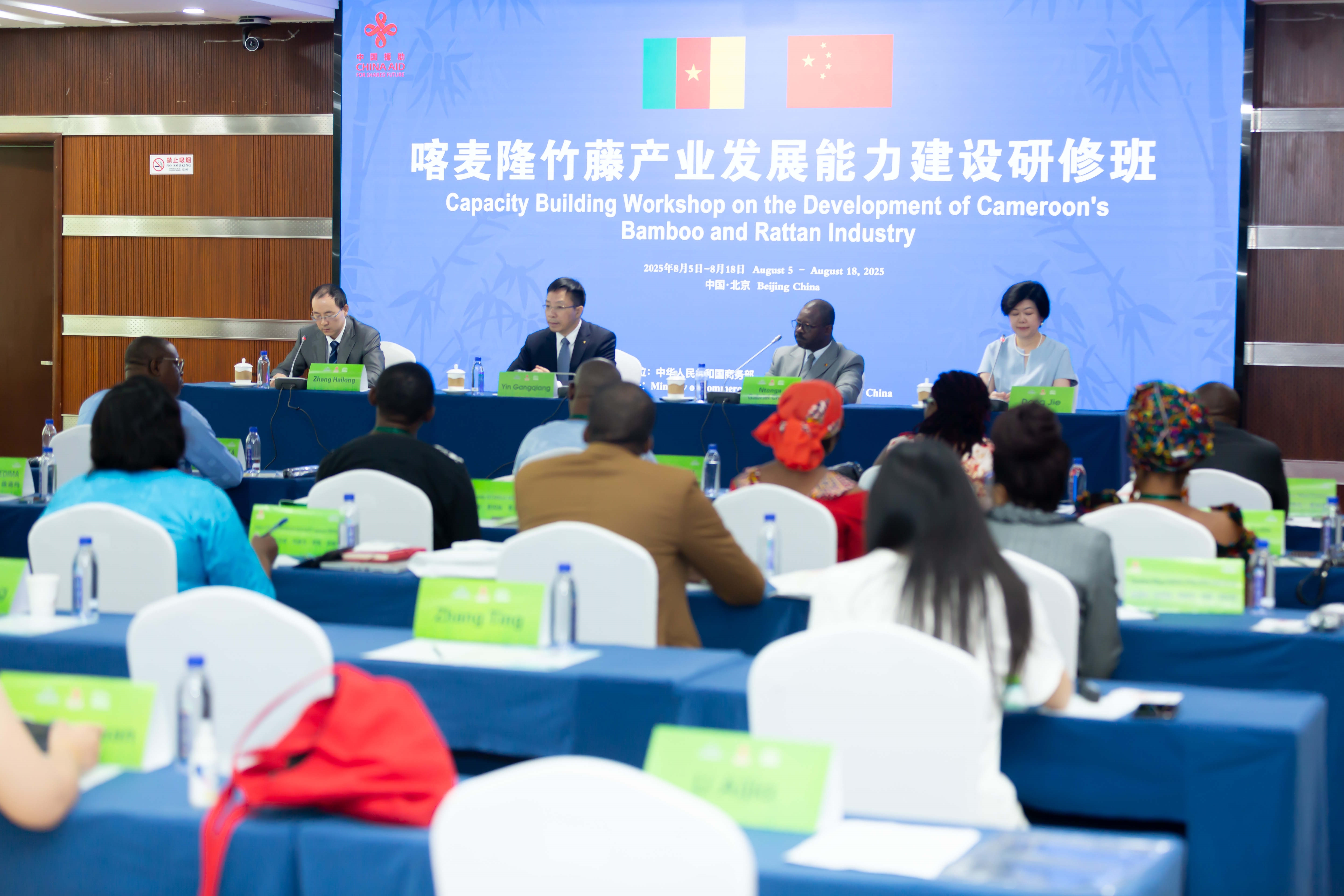 2025年8月5日,由商务部主办、国际竹藤中心承办的“喀麦隆竹藤产业发展能力建设研修班”在北京开班。喀麦隆驻华使馆公使衔参赞恩东嘎,国际竹藤中心党委书记、副主任尹刚强,商务部研修学院副处长张海龙出席开班仪式并致辞。