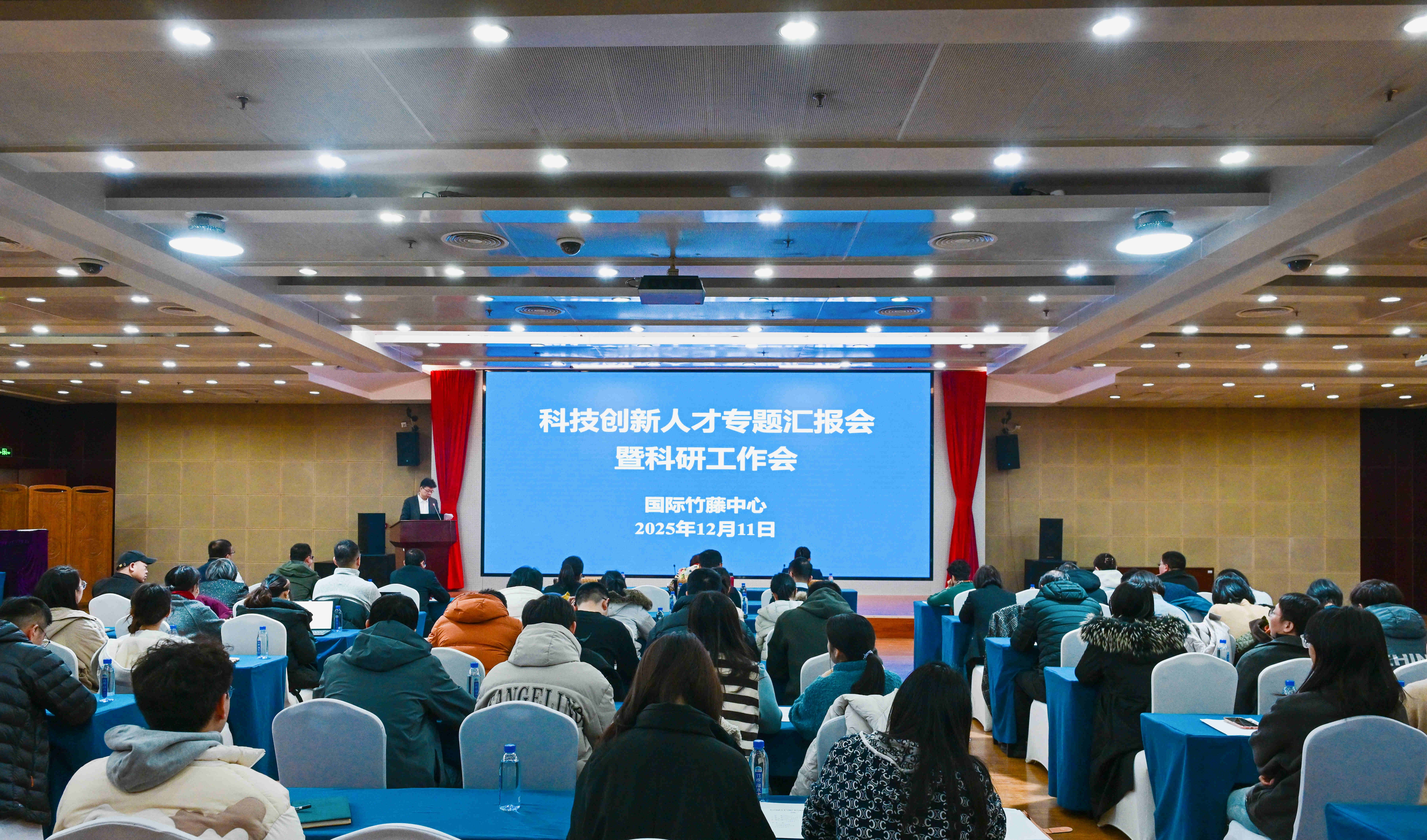 2025年12月11日,国际竹藤中心召开科技创新人才专题汇报会暨科研工作会,中心首席科学家、学术委员会主任委员江泽慧出席会议,中心主任覃道春、副主任李晓华及全体干部职工参加会议。