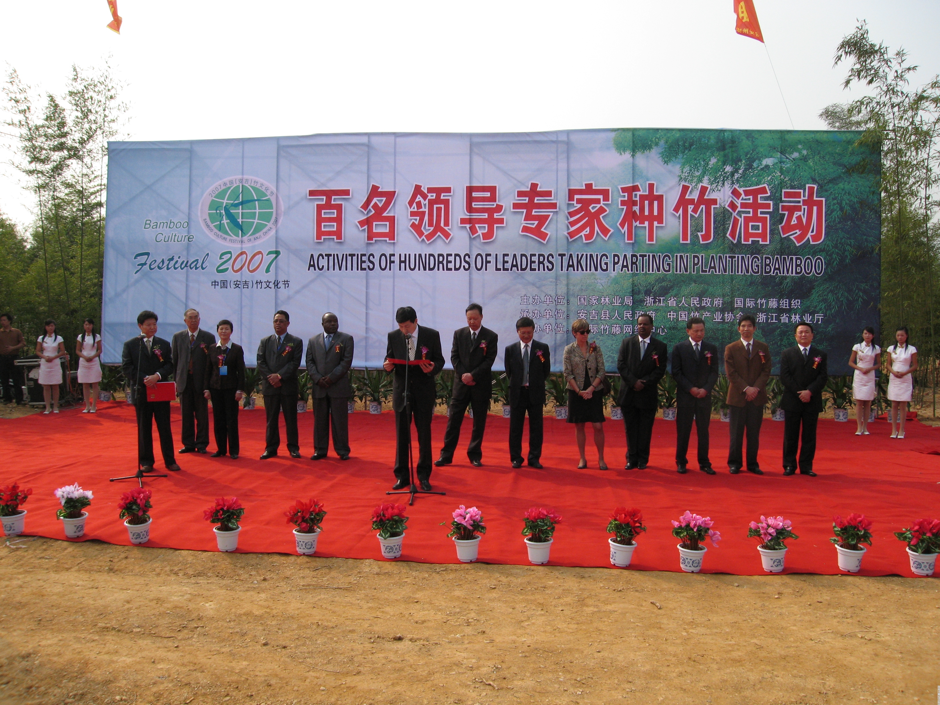 安吉地处长江三角洲经济区,杭嘉湖平原西北部,是全国著名的竹乡,拥有竹林面积105万亩,竹产业已经成为安吉的支柱产业,2006年产值达到了70多亿元。来自国际竹藤组织成员国埃塞俄比亚、加纳、多哥、卢旺达、塞拉利昂、喀麦隆、尼日利亚、越南等国驻华使馆的商务参赞和官员以及全国各地的专家、学者、30个“中国竹乡”的代表会聚一堂,以“竹的经济”为主题,畅谈竹产业发展新蓝图。国际竹藤组织总干事古珍女士、国际竹藤网络中心兼职博士生导师彭镇华教授和中国工程院院士张齐生教授分别围绕“国际竹经济”、“竹文化”和“竹产业发展”发表了主题演讲。岳主任一行还参加了部县合作共建新农村示范县仪式暨文化节种竹活动。