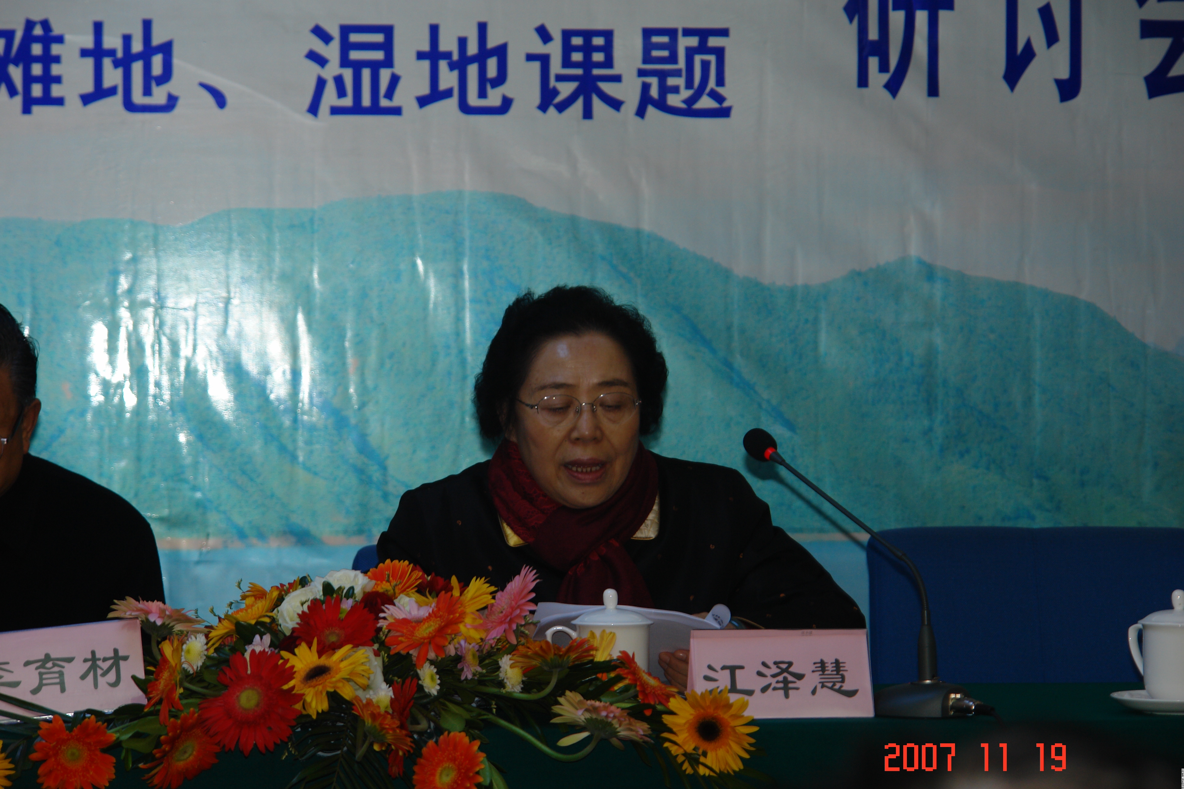 江泽慧在讲话中满怀深情地回顾了林业血防的历史,同时强调指出,林业血防生态工程是把林业生态建设与血吸虫病综合防治结合起来,实现了兴林富民、抑螺防病,改善生态和发展经济的有机结合,是血吸虫病防治的创新之举。林业血防试验示范区建设科技支撑以及低丘、滩地、湿地课题研究对于我国的生态环境建设、对于建设好社会主义新农村具有重要意义。她还系统总结了这些项目的进展情况,并对今后如何进一步搞好这些项目工作提出了新的要求与殷切希望。