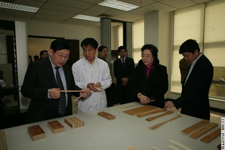 万钢一行在江泽慧陪同下参观了国际竹藤网络中心重点实验室和竹藤业展室。万钢在参观中指出,发展竹产业非常有潜力,竹子的利用价值很高。今后,我们将加强对竹藤材料、种质资源和生物技术、竹藤培育和竹藤化学等方面的科研工作的支持,加强对竹藤高附加值利用及竹、木材深加工研究的科技投入。