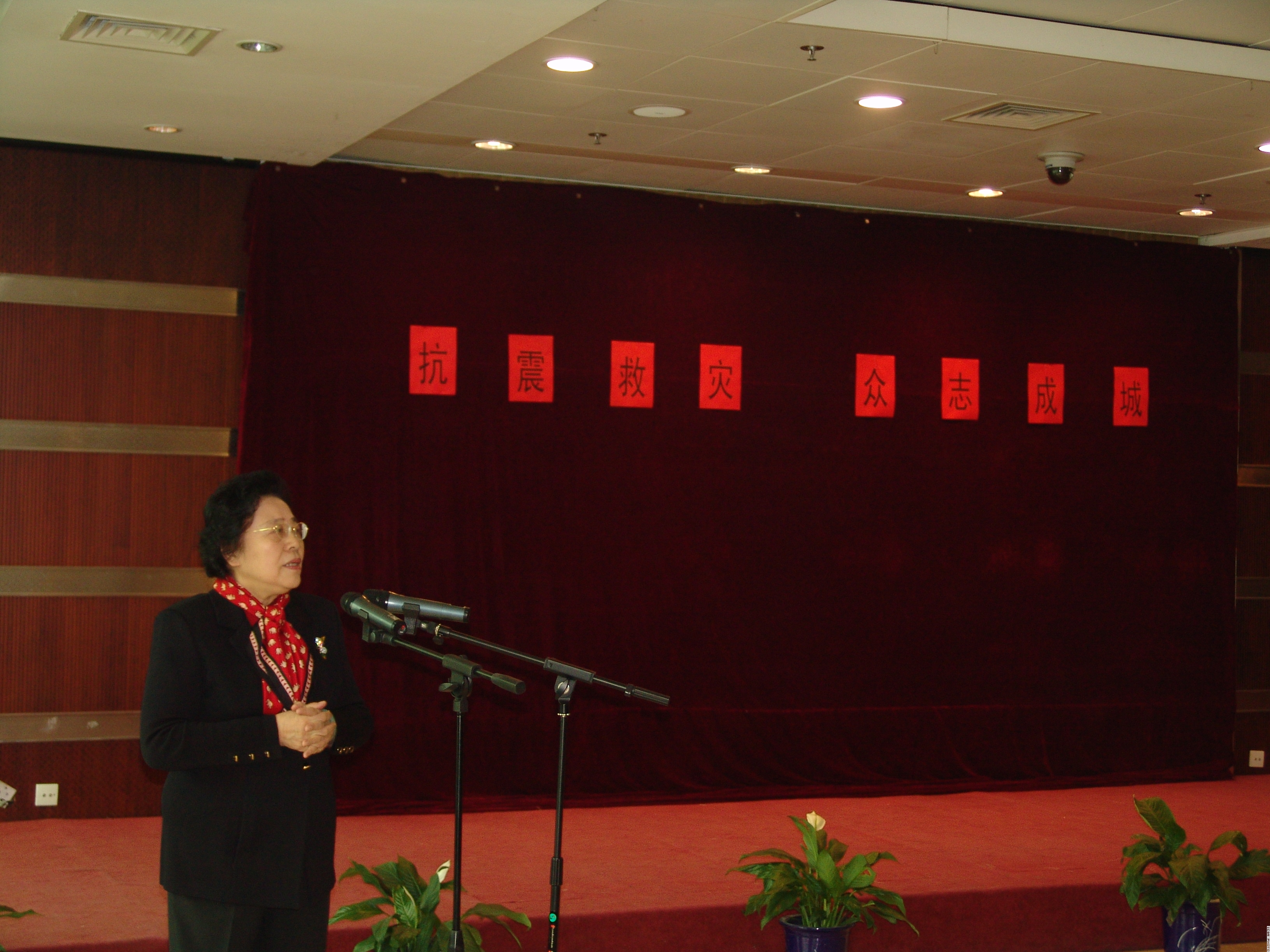 中心主任江泽慧发表了充满感情的动员讲话。她首先代表中心领导班子对本单位四川籍员工表示了亲切慰问。她说,5月12日这场突如其来的地震灾害对四川及周边地区造成了巨大的破坏,人员、财产损失严重,许多地方的交通和通讯至今中断。党和国家领导人高度重视,迅速部署抗震救灾工作,并亲赴一线指挥抗震救灾工作。国家林业局于地震当天就召开紧急会议,成立抗震救灾领导小组,紧急下拨200万元援助资金,派遣专人前往灾区,严密关切灾情动向,安置林业受灾干部职工,救助濒危野生动物,并发出通知号召各司局和直属单位组织开展捐款献爱心活动。她动员大家积极响应中央和局党组的号召,大力发扬“一方有难,八方支援”的人道主义精神,万众一心,众志成城,为灾区群众和灾后恢复建设奉献爱心。