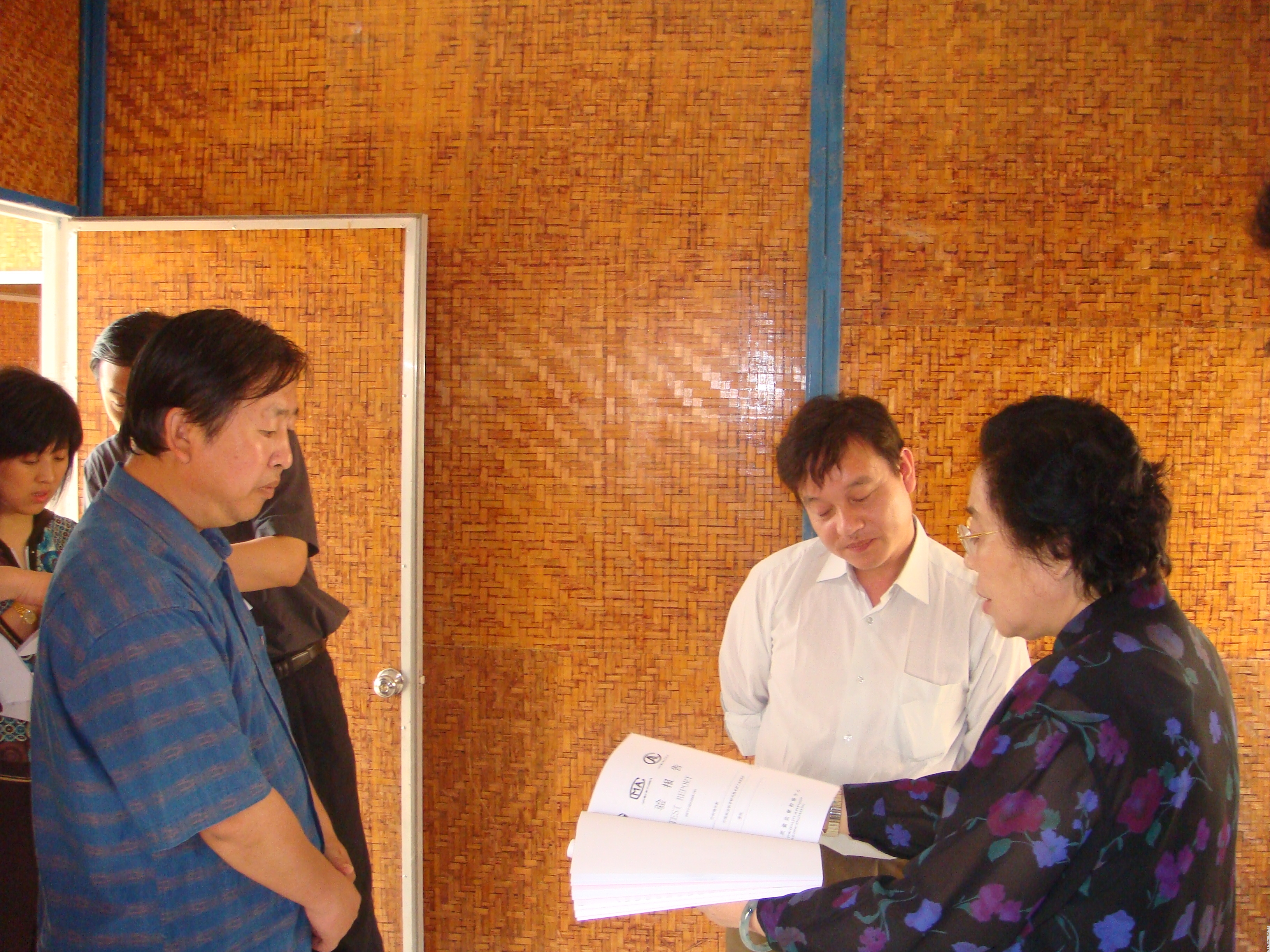 5月23日,中心主任江泽慧组织中心有关专家召开捐赠地震灾区抗震竹预制板房的可行性论证会议。5月26日,江泽慧亲自带队到北京市昌平区南口镇,考察了中心“十五”科技成果推广示范项目“竹材高效综合利用技术推广与示范”建造的2栋竹质预制板房。并再次主持召开了由国际竹藤网络中心、中国林科院木材研究所等相关单位专家参加的会议,经过充分论证,会议决定以中心的“十五”科技攻关和推广项目等科研成果为技术基础,由国际竹藤网络中心组织相关单位,分工负责,按照国家住房和城乡建设部《地震灾区过渡安置住房建设技术导则(试行)》的要求,科学有序地进行竹质抗震预制板房的结构设计、材料制造和组合安装工作。