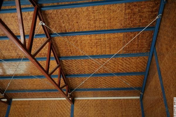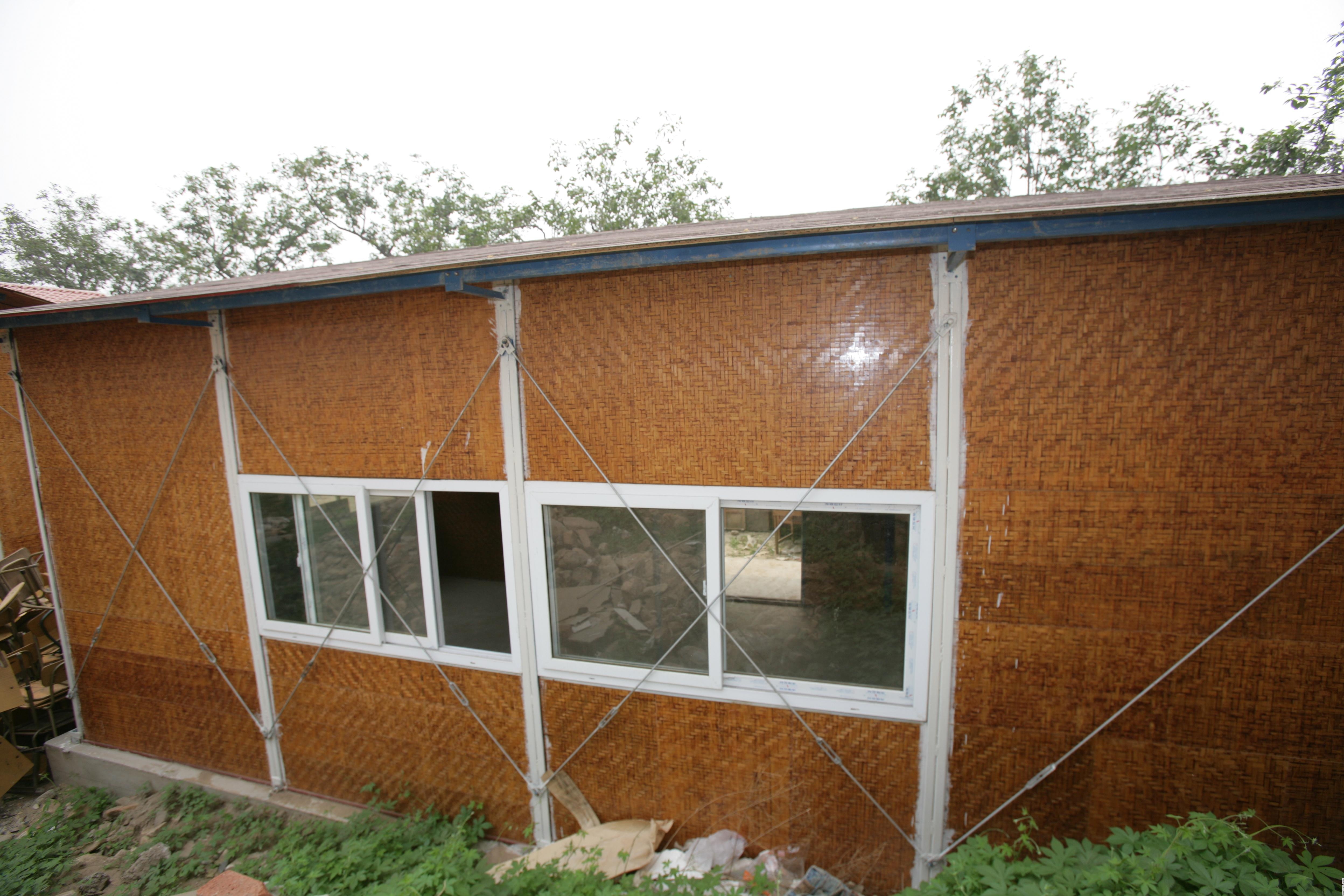 作为墙体和屋面主要材料的竹胶合板是以竹子经过开片和破篾,制成竹篾,再将竹篾编成竹帘和竹席,经过浸胶、沥干和干燥后,按工艺要求,表层竹席与芯层竹帘共同组坯,热压制成。