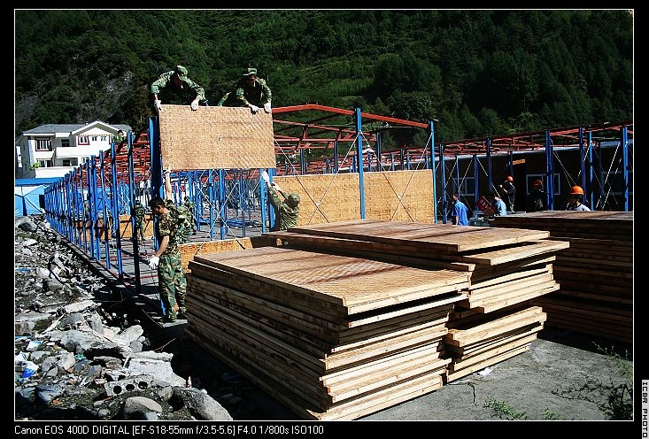 抵达卧龙后,援建小组的同志们不顾旅途劳累和高山反应,迅速全力以赴地投入到安装施工中,群策群力,现场解决施工中出现的各种问题。整个安装建设过程中,领导身先士卒,全体援建同志身体力行,与合作单位浙江福大竹木有限公司、诚栋公司的员工以及解放军某炮团一营二连指战员一道,齐心协力,经过3整天的紧张施工,抢在降雨之前顺利完成了第二批30套板房的安装任务。8月18日,陈森副主任代表国际竹藤中心与卧龙自然保护区的负责人签署了“援建卧龙抗震竹质预制板房移交单”,并移交了房门钥匙。至此,国际竹藤中心援建四川卧龙灾区的50套1000平方米竹质预制板房全部建成完工并交付使用。这50套竹质预制板房将为灾区人民恢复正常生产生活和顺利过冬发挥积极的作用。