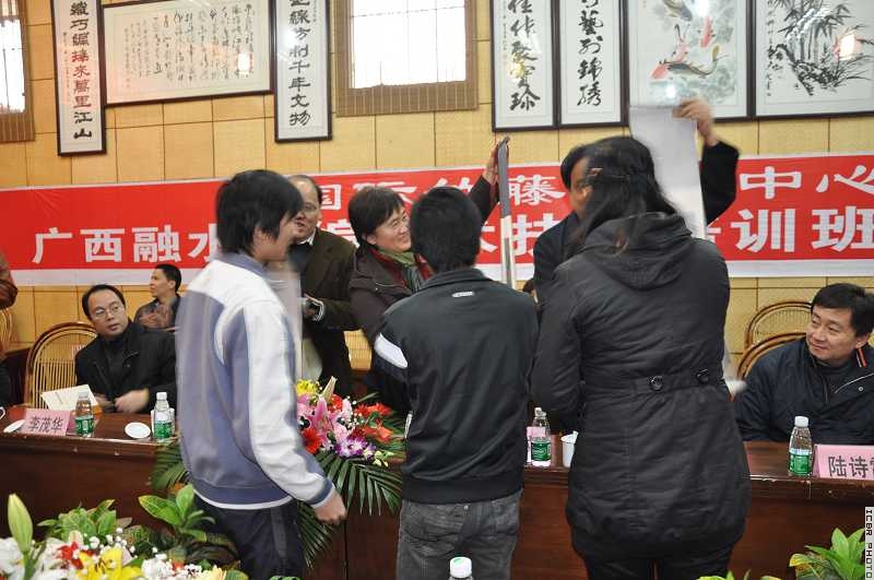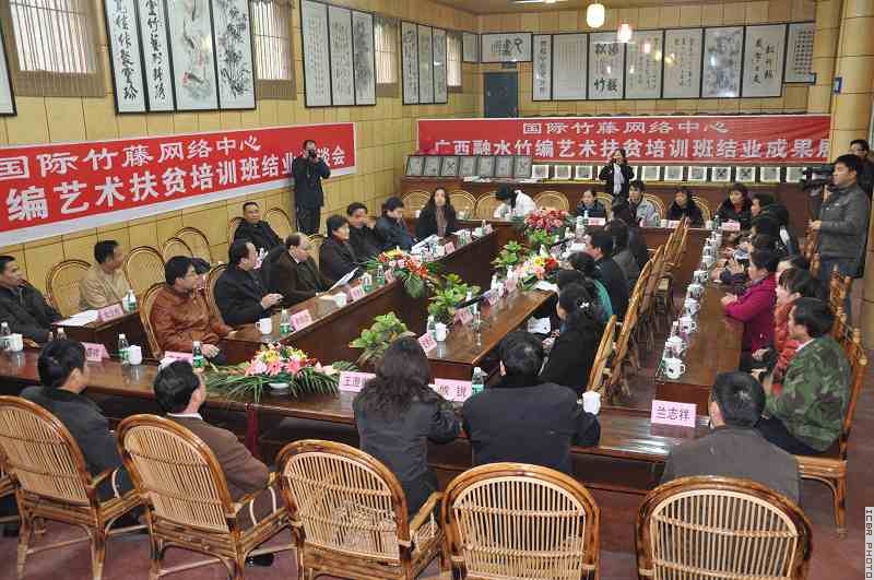 2009年11月19日,广西融水竹编艺术扶贫培训班结业座谈会在国际竹藤网络中心培训基地四川省青神县“中国竹艺城”成功举行。国家林业局计资司副司长汤晓文、开发处副处长陆诗雷,国际竹藤网络中心副主任程良、培训处副处长李蓝,广西自治区林业厅巡视员廖培来、计财处副处长李茂华,融水县副县长许华功等领导和相关人员出席了座谈会并讲话。来自融水苗族自治县的21名学员经过为期45天的不间断、封闭式地平面竹编艺术培训后,圆满完成了既定的培训目标,向上级领导交出了满意的作品。