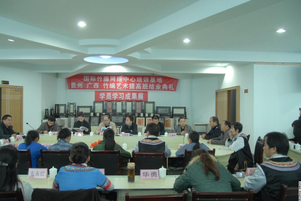 2010年11月15日,国际竹藤网络中心(以下简称“竹藤中心”)为广西、贵州两地举办的竹编艺术提高班在中心四川青神培训基地顺利结业。局计资司、竹藤中心、广西壮族自治区融水县林业局和贵州省荔波县茂兰自然保护区管理局、四川省青神县林业局等相关领导出席了结业式。来自广西融水和贵州荔波的20名苗、壮、布依、汉族学员进一步系统地学习了竹编文化理论、12—24丝精档竹编技术、竹编图案设计及装框、装裱、装架技术等课程,经过60天的培训,圆满完成了学习任务,顺利结业。