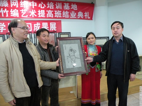 广西学员代表及其当地林业主管部门领导向竹藤中心赠送学员们亲手编制的竹编画