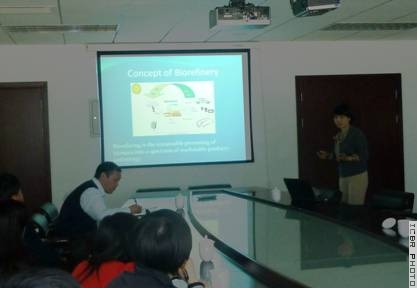 博士从生物炼制(biorefinery)的概念与特点切入,介绍了以可再生的生物质资源替代不可再生资源,实现工业模式从煤、石油炼制向生物炼制转变这一新型化工模式发展的现状。中心科研人员就农林剩余物为原料开展生物炼制技术应用研究等方面的问题进行了热烈的讨论。