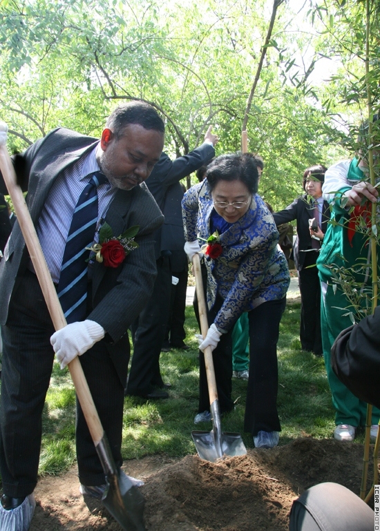 国际竹藤组织董事会联合主席江泽慧教授与INBAR理事会主席孟加拉驻华大使孟什·法亚兹·艾哈麦德先生共同种植紫竹