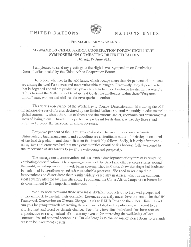 联合国秘书长潘基文致信中非合作论坛框架下荒漠化防治高级研修班