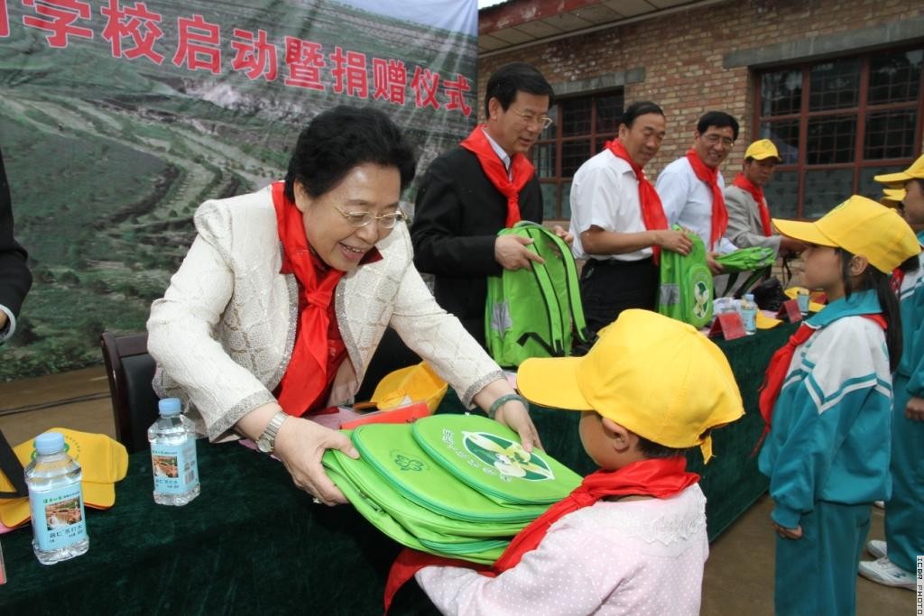 江泽慧代表中国生态文化协会向赵家铺学校校长王志明赠送捐赠物资(田远村 摄)
