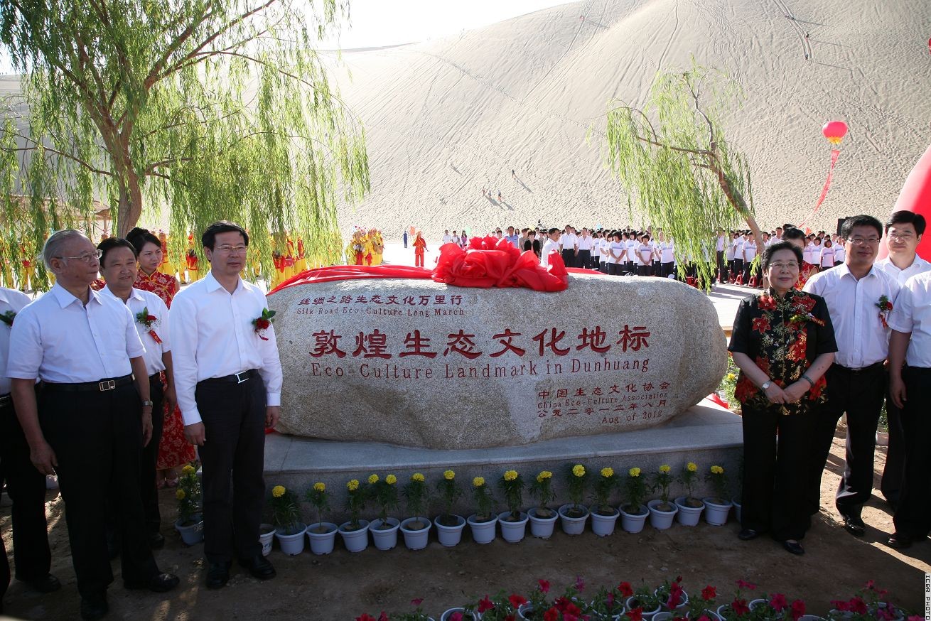 8月21日,在古丝绸之路的咽喉之地、举世闻名的中国历史文化名城甘肃敦煌,“丝绸之路生态文化万里行”敦煌生态文化地标揭幕仪式在鸣沙山月牙泉景区举行。全国政协人口资源环境委员会副主任、中国生态文化协会会长、“丝绸之路生态文化万里行”活动组委会主任江泽慧和甘肃省委常委、副省长李建华为敦煌生态文化地标揭幕,并为新成立的甘肃省生态文化协会揭牌。