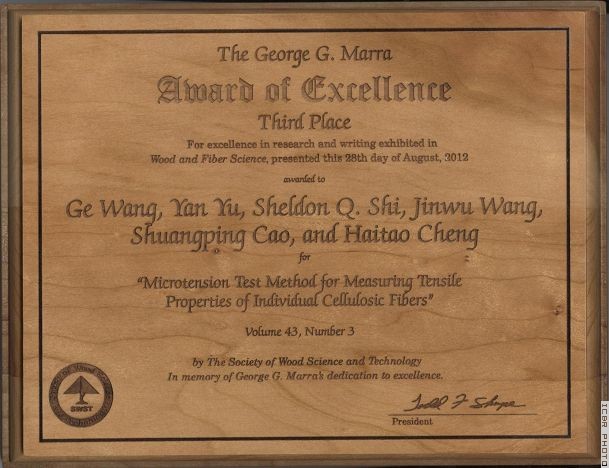 竹藤生物质新材料研究中心科研人员荣获美国木材科学与技术学会(SWST)优秀论文奖