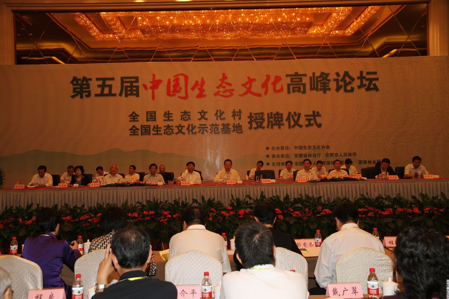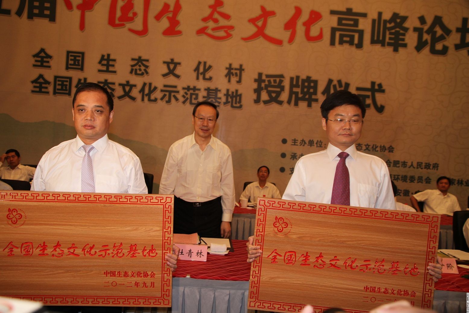 ,第五届中国生态文化高峰论坛在安徽省合肥市召开,全国政协副主席杜青林出席开幕式,并为“全国生态文化示范基地”和“全国生态文化村”授牌。国家林业局党组成员、中央纪委驻局纪检组组长陈述贤,安徽省省委副书记孙金龙出席开幕式并讲话,国家知识产权局党组成员、中央纪委驻局纪检组组长、中国生态文化协会副会长肖兴威主持开幕式。全国政协人口资源环境委员会副主任、国际竹藤组织董事会联合主席、中国林学会理事长、中国生态文化协会会长江泽慧作主题报告。