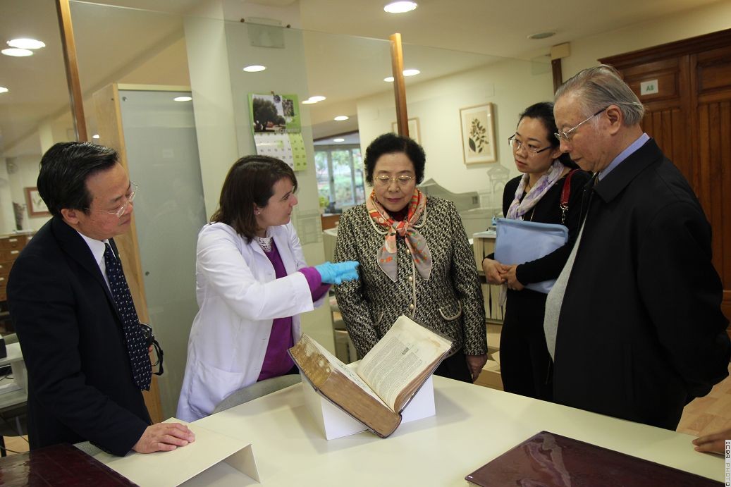 代表团首先在植物园园长费里诺教授的陪同下参观了植物园的标本馆,观赏了馆内珍藏的部分古代植物蜡页标本。江主任详细询问了标本馆的馆藏情况、标本编目方法以及保存条件。之后代表团还参观了植物园的图书馆。图书馆的负责人向代表团一行展示了珍藏的植物学古典书籍,包括16世纪的植物学典籍以及植物园17世纪的科研出版物等。在参观了植物园的现代化温室后,代表团一行与植物园的科研团队进行了简短的学术交流。费里诺教授简要向代表团介绍了植物园的基本情况以及近年来在植物种类地理学、分类学、进化学、植物保存以及植物学史等领域的研究情况。江泽慧主任则向对方简要介绍了中心的基本情况,以及中心在竹藤、花卉及热带种质资源保存、竹藤标本馆建设等方面所取得的进展。江主任表示,西班牙皇家植物园是世界上著名的植物园之一,历史悠久。植物园丰富的品种和标本收藏、先进的保存设施以及科学的管理给代表团留下了深刻的印象,希望国际竹藤中心将来与植物园能够建立起长期的合作关系,在竹藤、花卉种质资源交换、标本交流、植物新品种鉴定和保存、出版物和信息交流等方面开展合作。