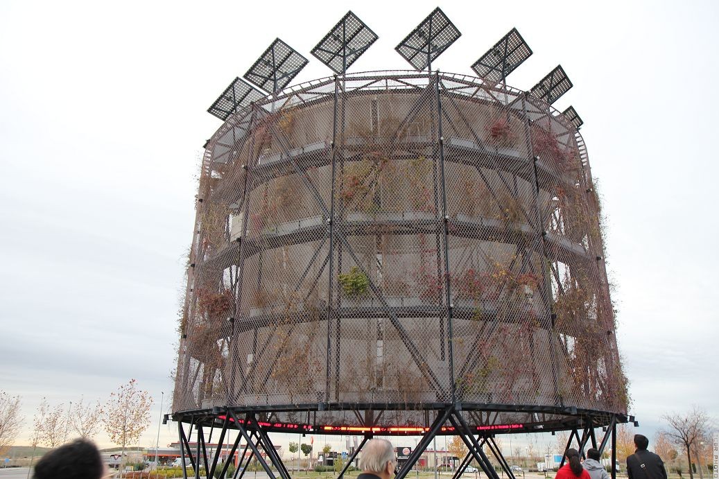 “空气树”是马德里近郊新开发的29000套住宅项目“巴耶卡斯生态步行道”的组成部分,为该地段的三座树状塔型结构。屋顶设置有太阳能板,墙体为网状编织结构,覆盖有各种攀缘植物如忍冬、常青藤等。这些植物生长环境空气调节以及喷淋系统所需的能量由太阳能板提供,墙面的攀援植物在夏天生长繁密,可以吸收大量阳光。因此空气树下的温度在夏天要比周围低8-10度,成为当地社区居民纳凉娱乐的首选之地。该项目2007年曾获得AR年轻建筑师设计奖。