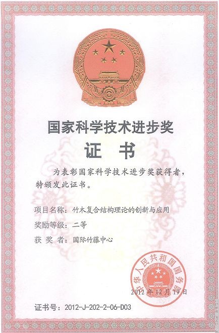 国际竹藤中心参与完成的“竹木复合结构理论的创新与应用”获2012年国家科技进步二等奖。该项目由十家单位联合完成,我中心为第三完成单位,第一、二完成单位为南京林业大学、新会中集木业有限公司,中心费本华研究员等为第六完成人。