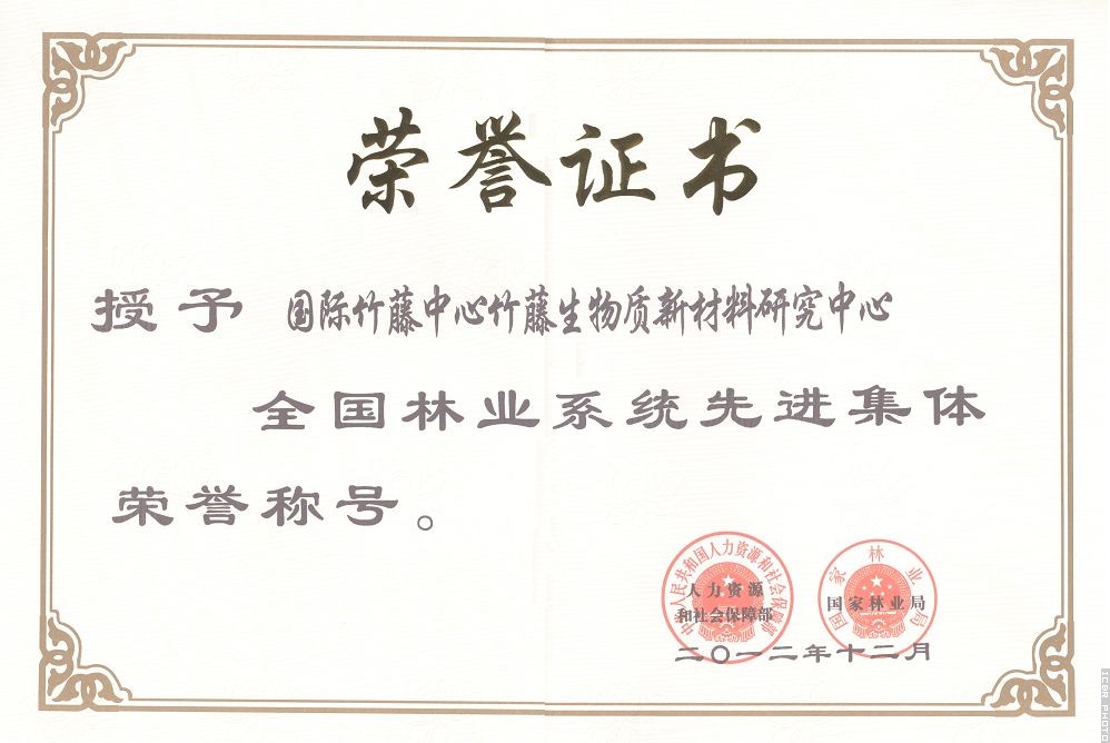 近日,国家人力资源和社会保障部、国家林业局对全国林业系统先进集体、劳动模范和先进工作者进行表彰,国际竹藤中心竹藤生物质新材料研究中心被授予“全国林业系统先进集体”称号。