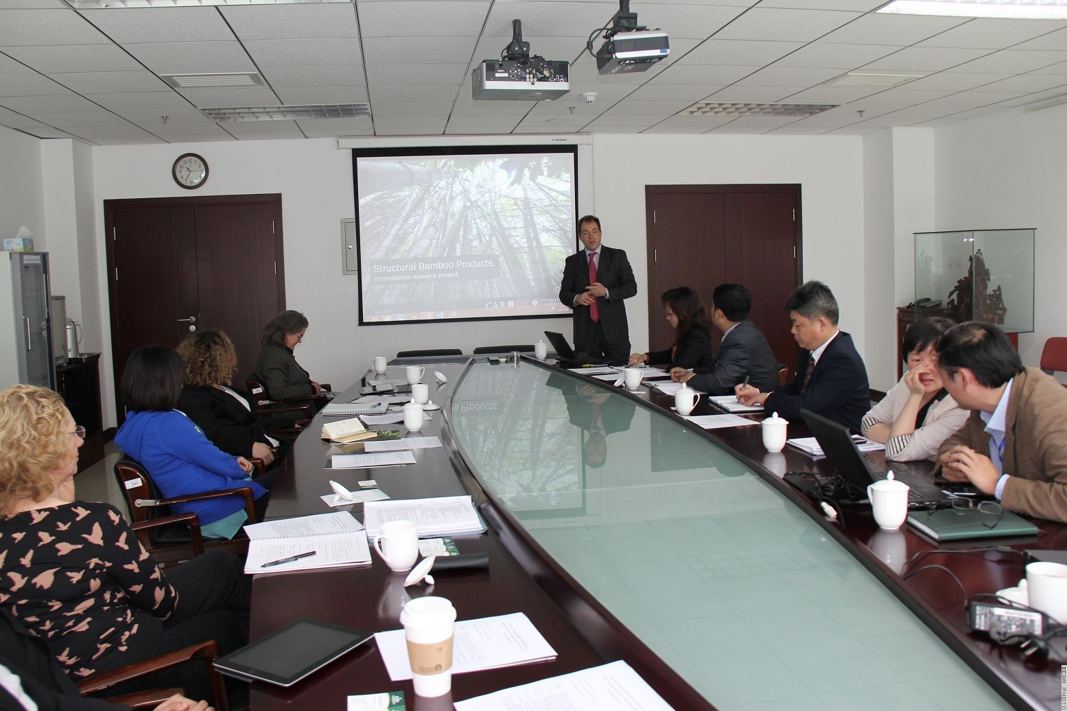 2013年4月24日上午,在国际竹藤组织(INBAR)的协调下,来自英国剑桥大学(University of Cambridge)和加拿大英属哥伦比亚大学(UBC)的专家学者一行7人访问国际竹藤中心,就竹建筑材料及竹结构建筑议题与中心相关科研人员开展学术交流。