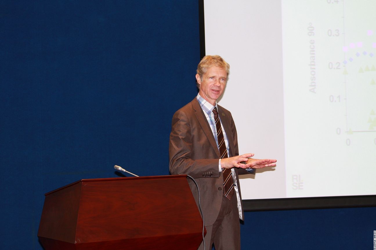 会见前,沙门教授还在中心六层报告厅做了“从分子的观点理解木材的形态和力学性质”的学术报告。报告会由国际处副处长余雁研究员主持,中心相关科研专家、研究生60余人参加了报告会。沙门教授较详细介绍了他领导的研究团队在木材细胞壁结构与性能领域的主要工作,特别是应用动态红外光谱技术研究木材细胞壁三大组分之间关系所取得的研究成果。学术报告对中心正在开展的竹子细胞壁结构与功能研究有很好的借鉴意义。会后,沙门教授还参观了中心竹藤展厅及重点实验室。
