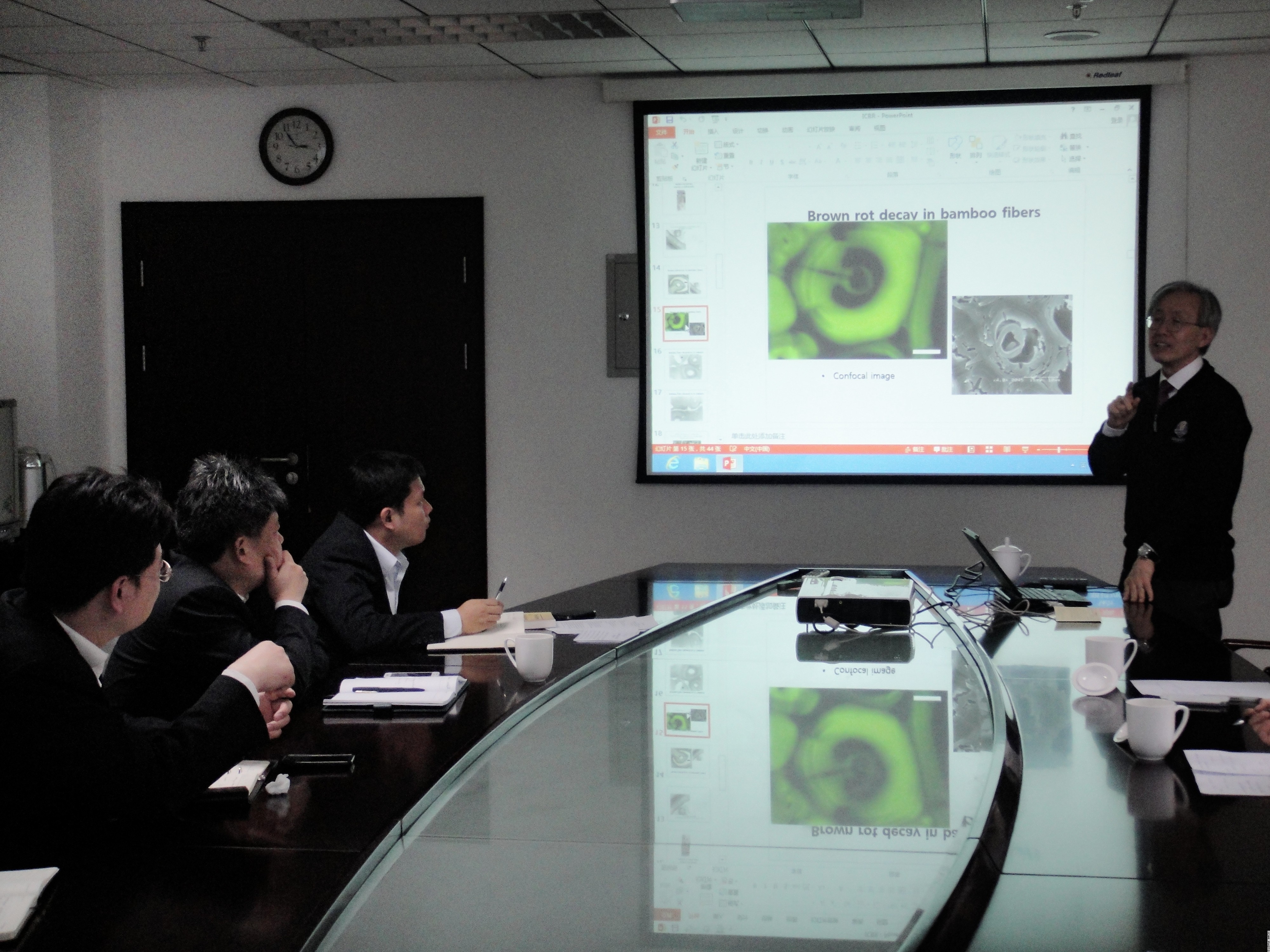 2013年12月10日上午,国际木材科学院院士、韩国全南国立大学教授、前校长金润受(Kim Yoon Soo)教授来国际竹藤中心开展学术交流,作了题为“木腐菌和细菌降解竹材的形态特征”的学术报告,并参观了中心竹藤展厅和竹藤重点实验室。中心常务副主任费本华以及材料中心和化学中心有关科研人员及研究生参加学术交流。
