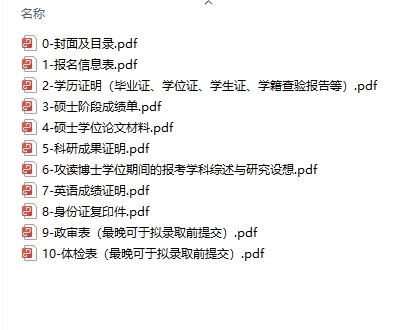申请材料的封面及目录请使用规定模板(附件1),并严格按照目录顺序扫描原件,每份材料单独形成PDF文档(具体命名及顺序见下图),通过电子邮件发送至中心研究生部邮箱(wangziye@icbr.ac.cn)。
